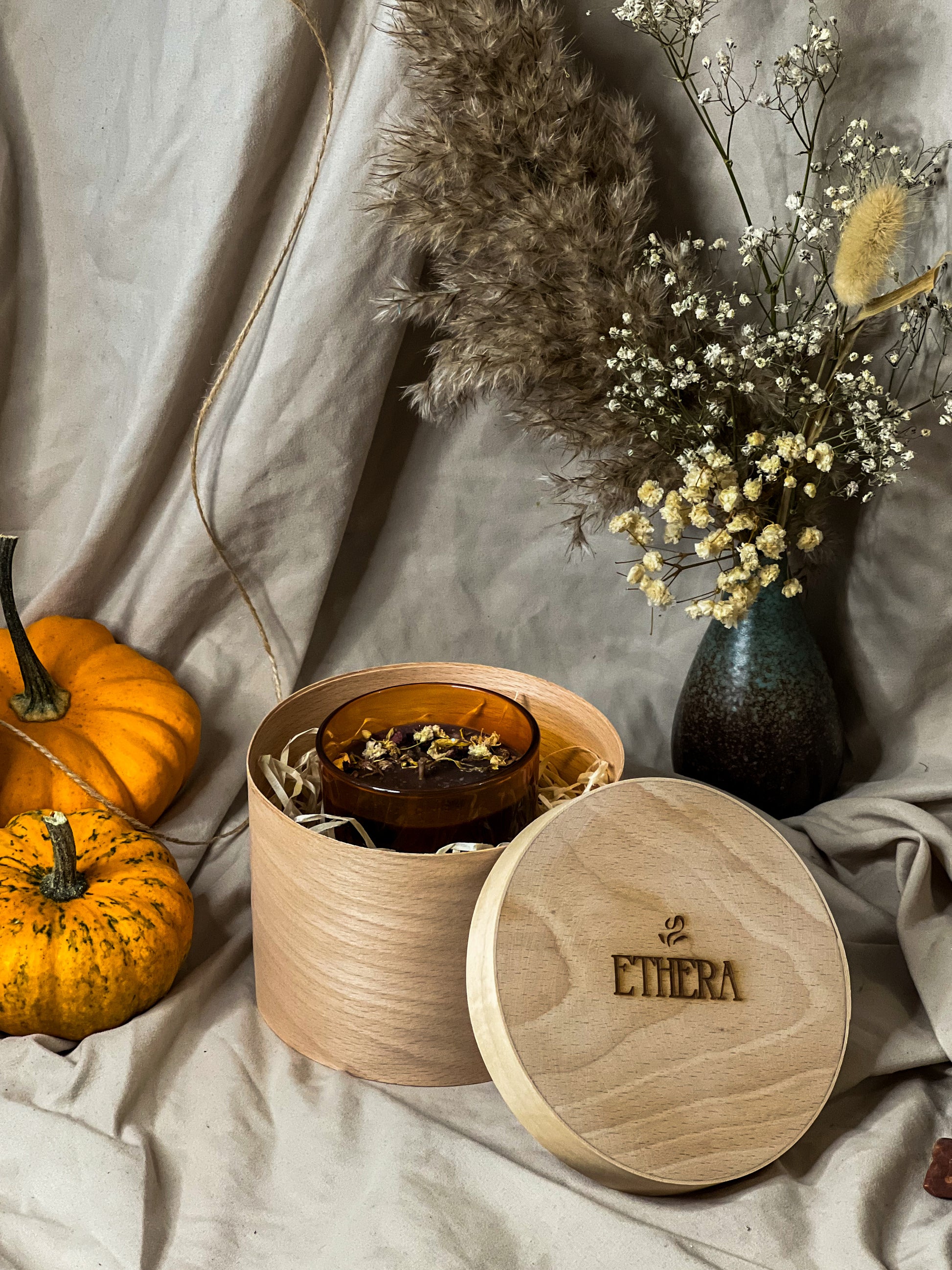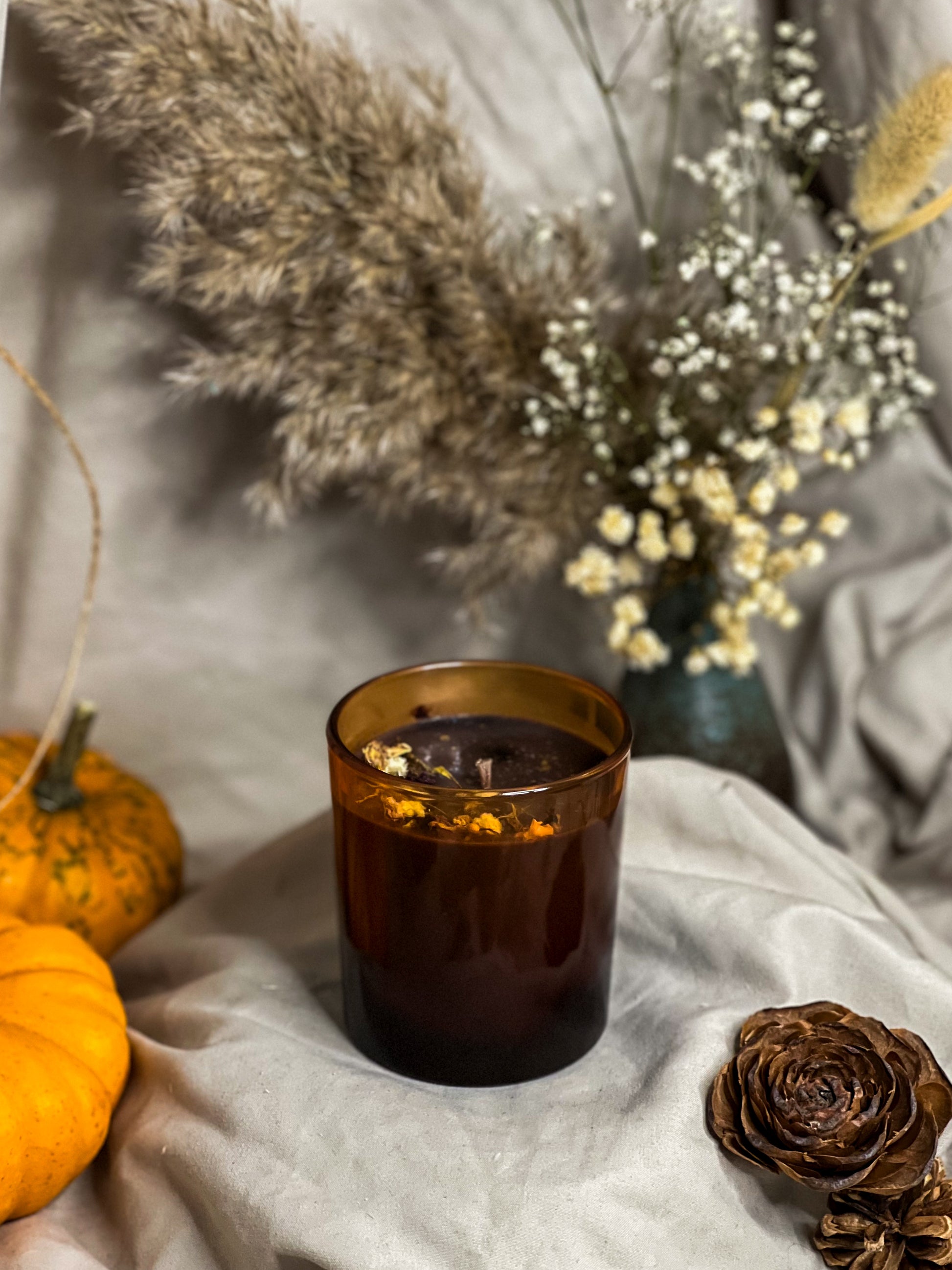 Decorated with dried flowers and biodegradable glitter, every candle is given a unique and eco-conscious finishing touch.