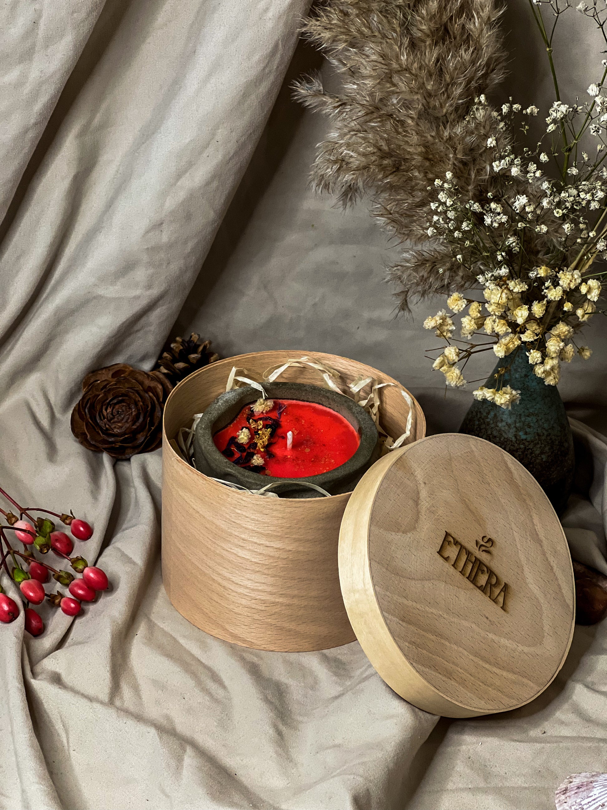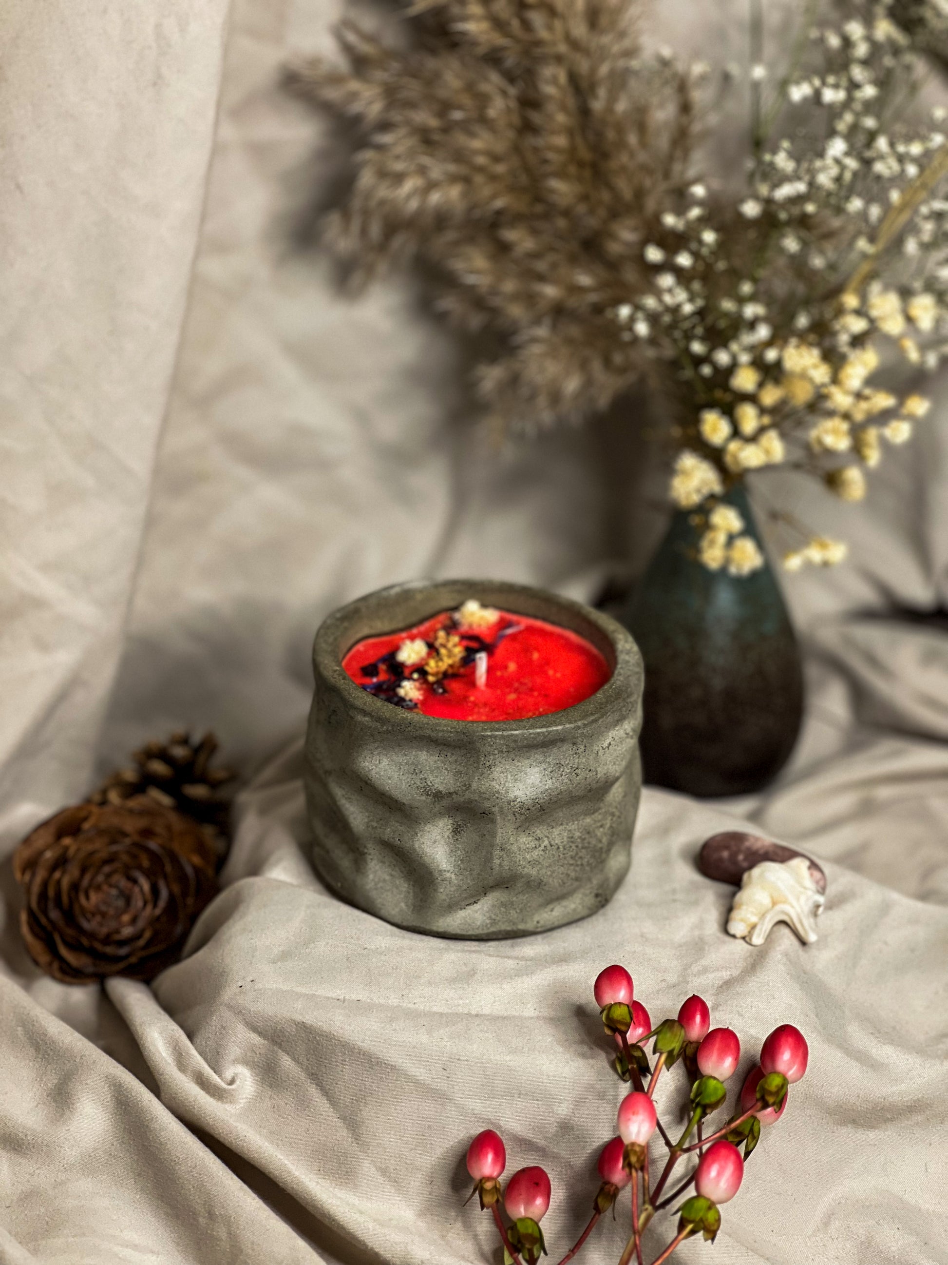 This version is tinted with a red eco-friendly pigment, giving the wax a vibrant and playful color that perfectly matches the candy apple theme. Poured into a handcrafted concrete holder, it combines artisanal minimalism with a bold, cheerful touch.