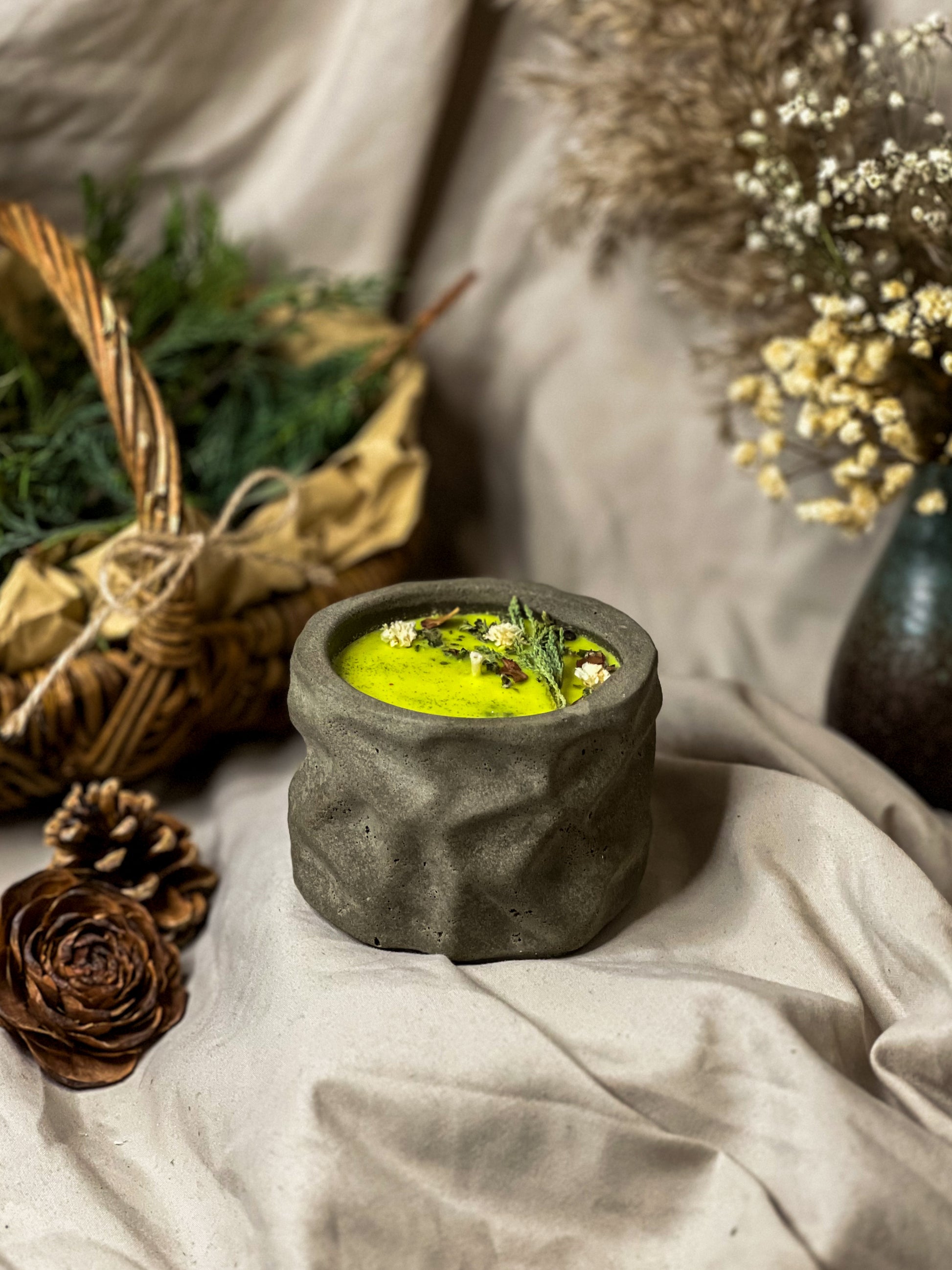 Hand-poured into a concrete holder, each candle embodies minimalist design with a natural touch. The raw texture of concrete contrasts beautifully with the clean flame, making it both a fragrance experience and a timeless decorative piece.