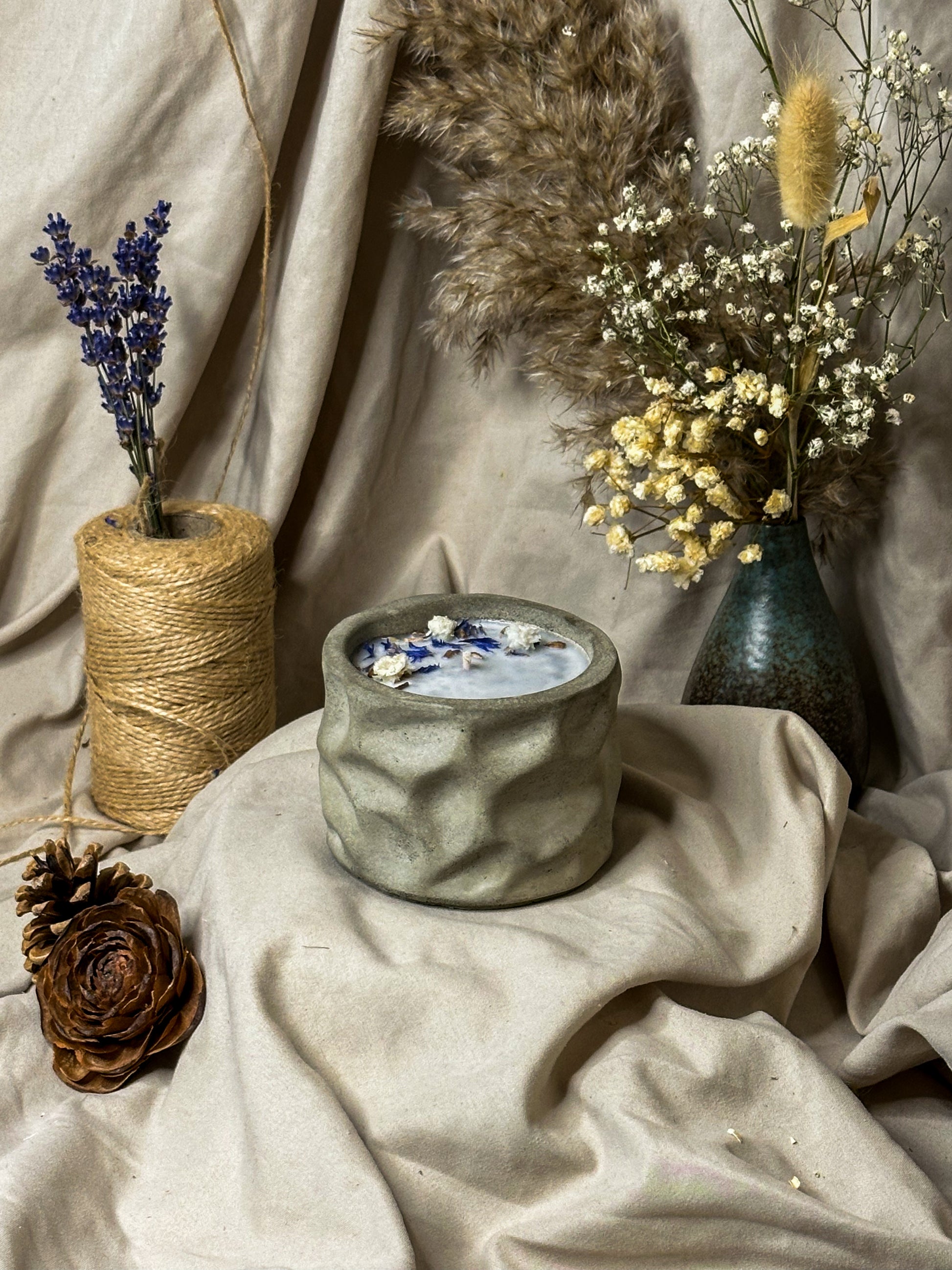 Hand-poured into a concrete holder, it combines the raw elegance of artisan design with the gentle beauty of lavender. Each candle is finished with dried flowers and biodegradable glitter, creating a refined and eco-conscious touch.