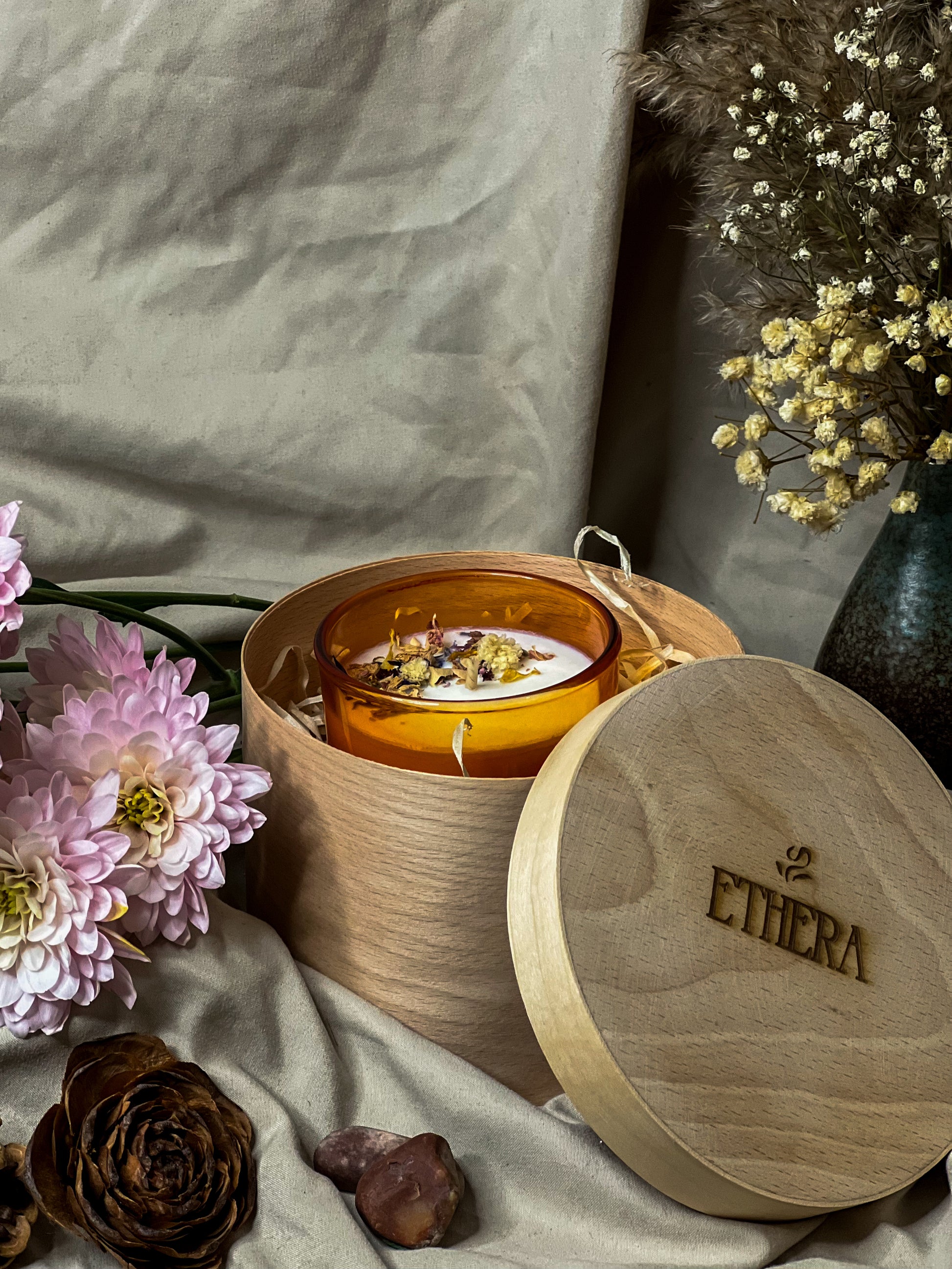 Decorated with dried flowers and biodegradable glitter, every candle is given a unique and eco-conscious finishing touch.